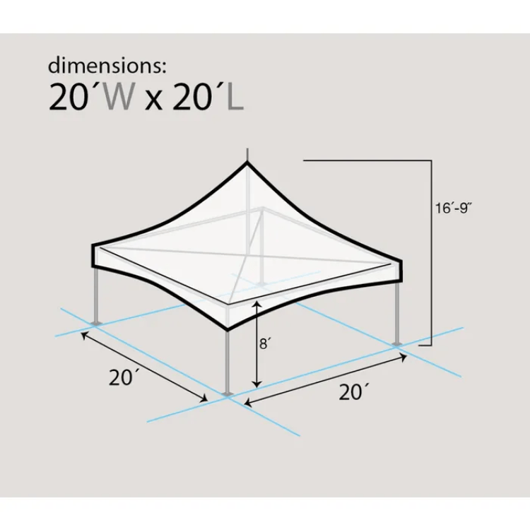 Elevate your next outdoor occasion with our 20x20 High Peak Tent. Combining a sleek, swooping roofline with a heavy-duty professional finish, this frame tent offers a spacious 400 square feet of covered area without any center poles to obstruct your floor plan.